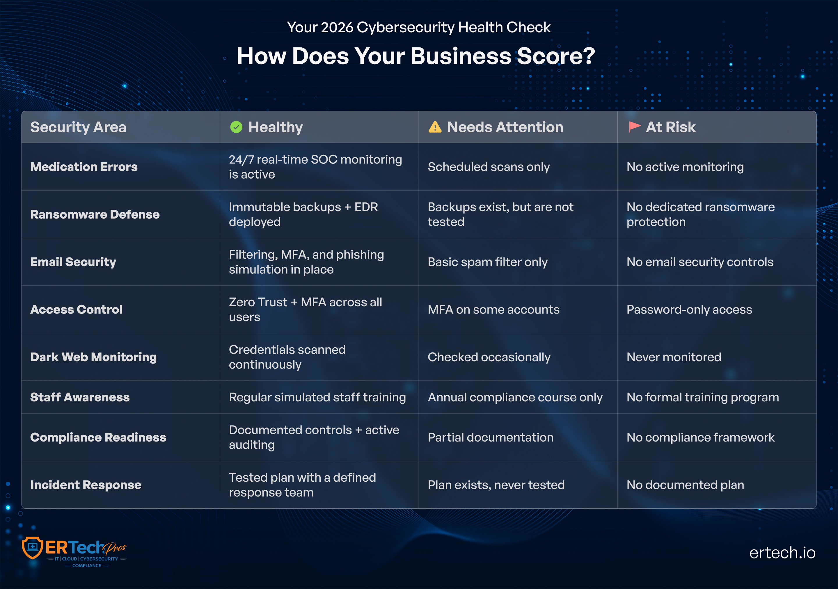 ER Tech Pros has spent close to three decades specializing in healthcare IT and cybersecurity, maintaining 100% HIPAA compliance across its client base. Its cybersecurity services for healthcare organizations cover the full spectrum: AI-driven threat detection, dark web monitoring for leaked patient data, compliance expertise across HIPAA and other frameworks, and a Virtual CISO service that provides fractional security leadership for organizations that need strategic guidance without a full-time hire. For healthcare organizations navigating this threat environment, generic security solutions applied without sector-specific expertise leave gaps that attackers find quickly.